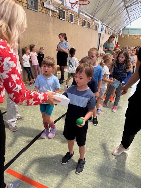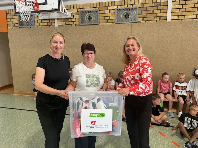 Zusätzlich überreichten die Stadtwerke den Schulleitungen, Frau Koller und Herrn Schleese, jeweils eine Kiste mit neuen Sportgeräten für den Sportunterricht – ein Beitrag, der den Kindern auch langfristig zugutekommt.